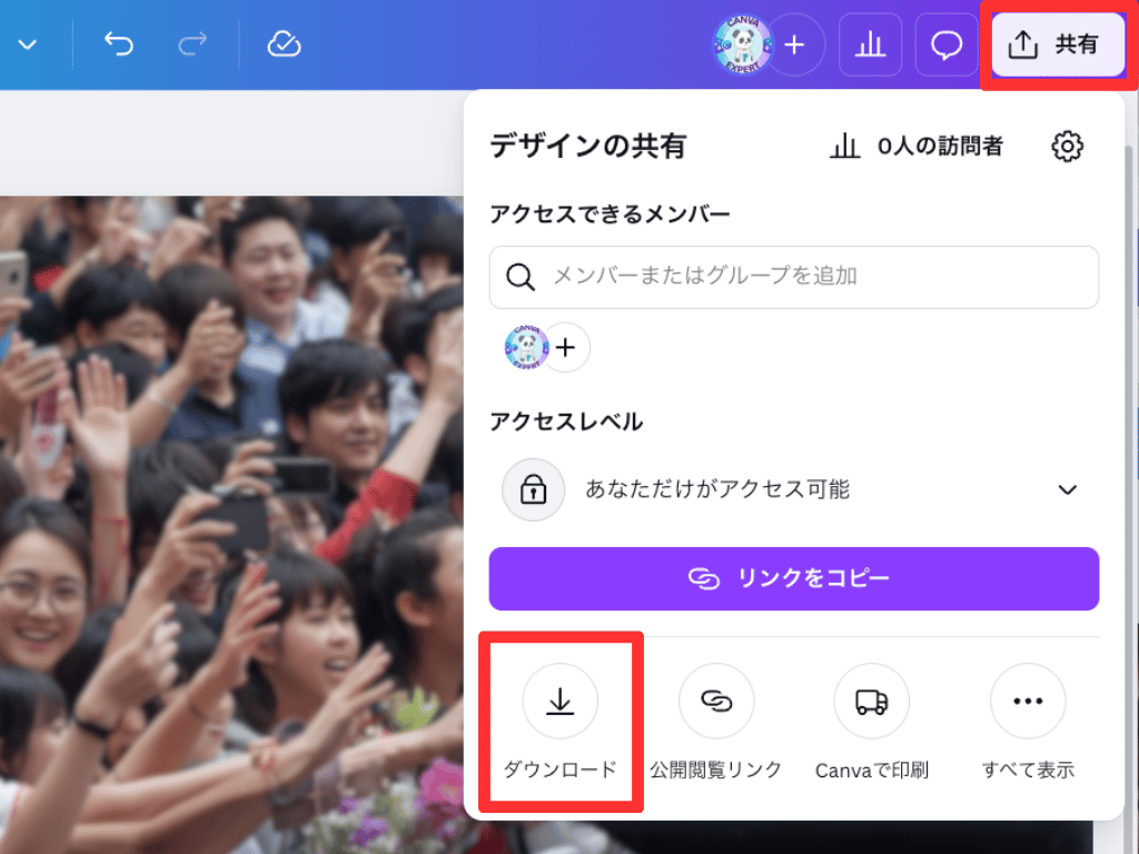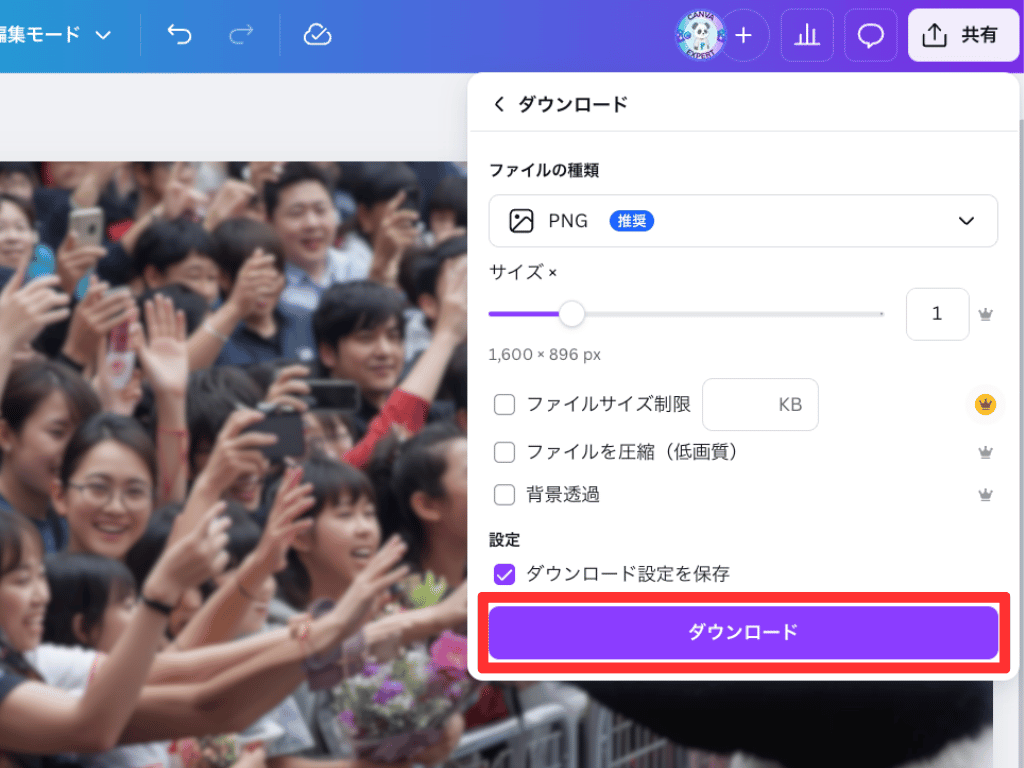「共有」→「ダウンロード」をクリック