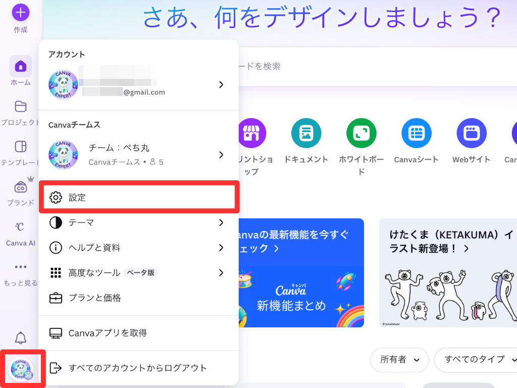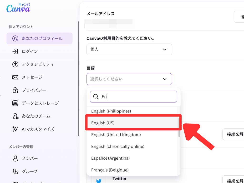 まず最初に、Canvaの言語設定を英語に変更しましょう。