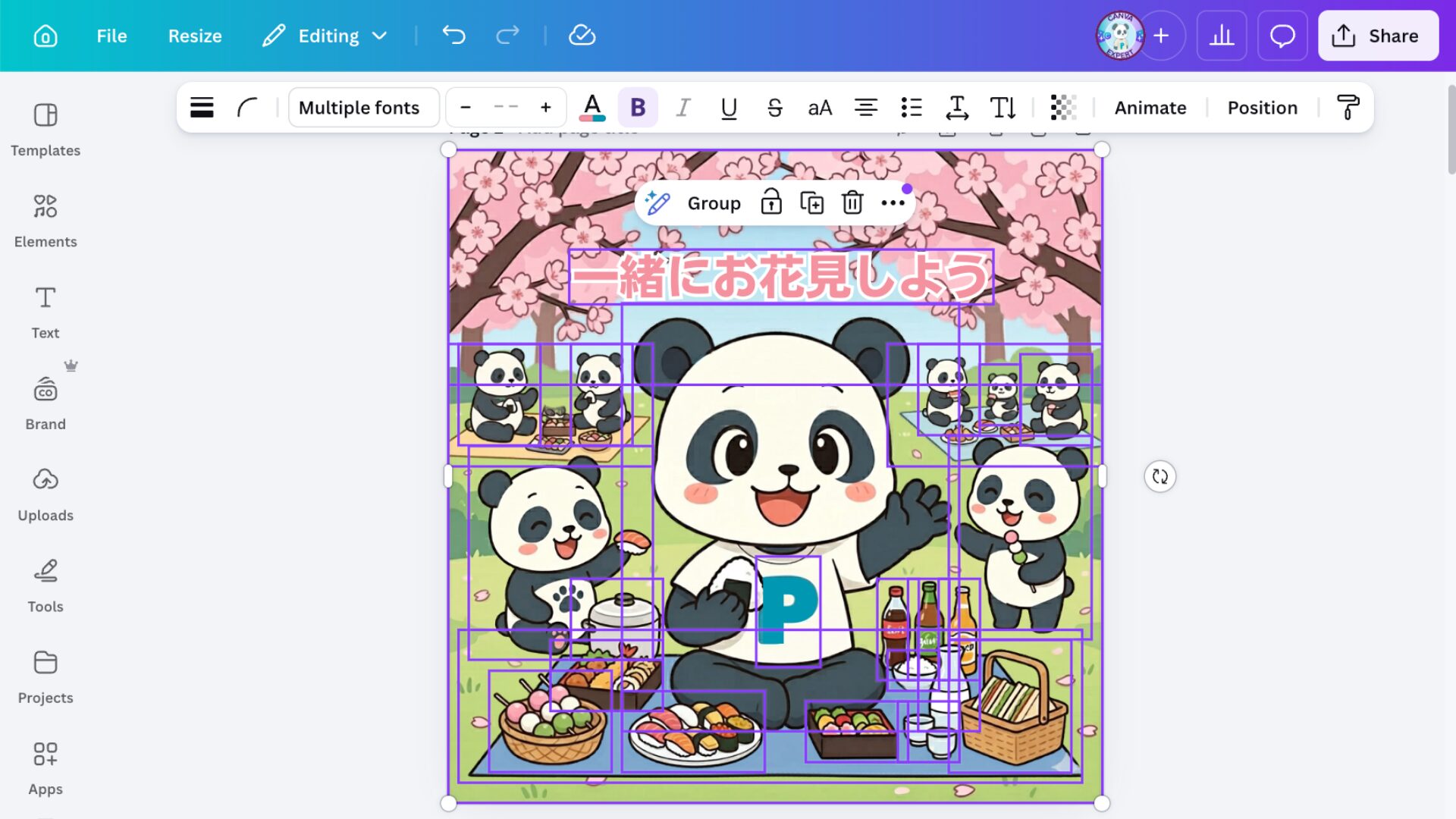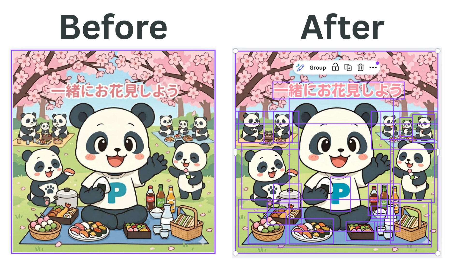 1枚のフラット画像が自動でレイヤーに分解され、テキスト・イラスト・背景をそれぞれ自由に編集できるようになります。