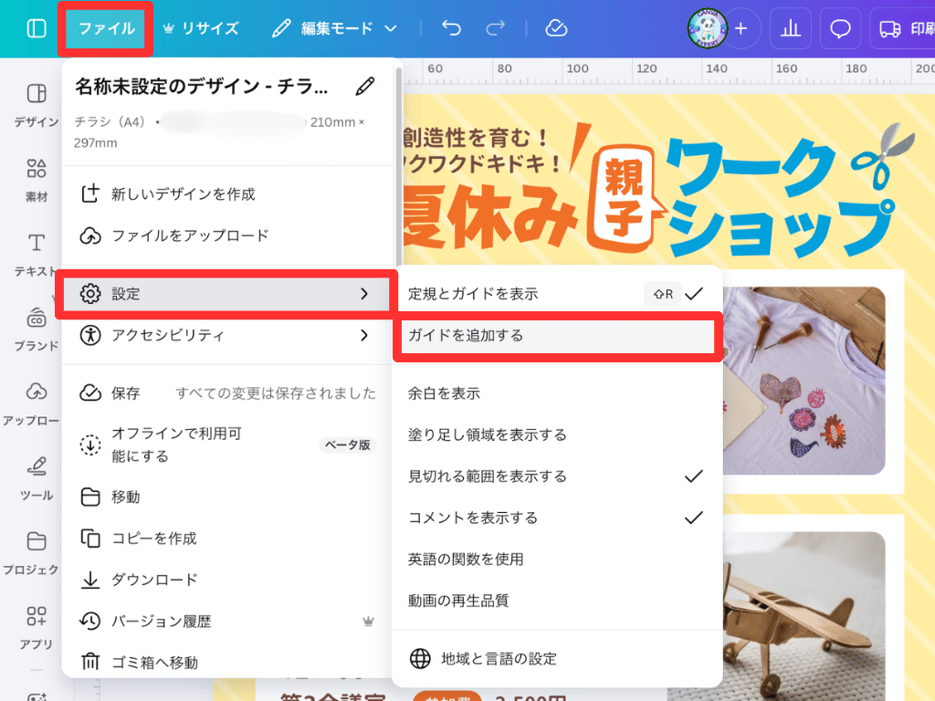 「ファイル」→「設定」→「ガイドを追加する」を選択
