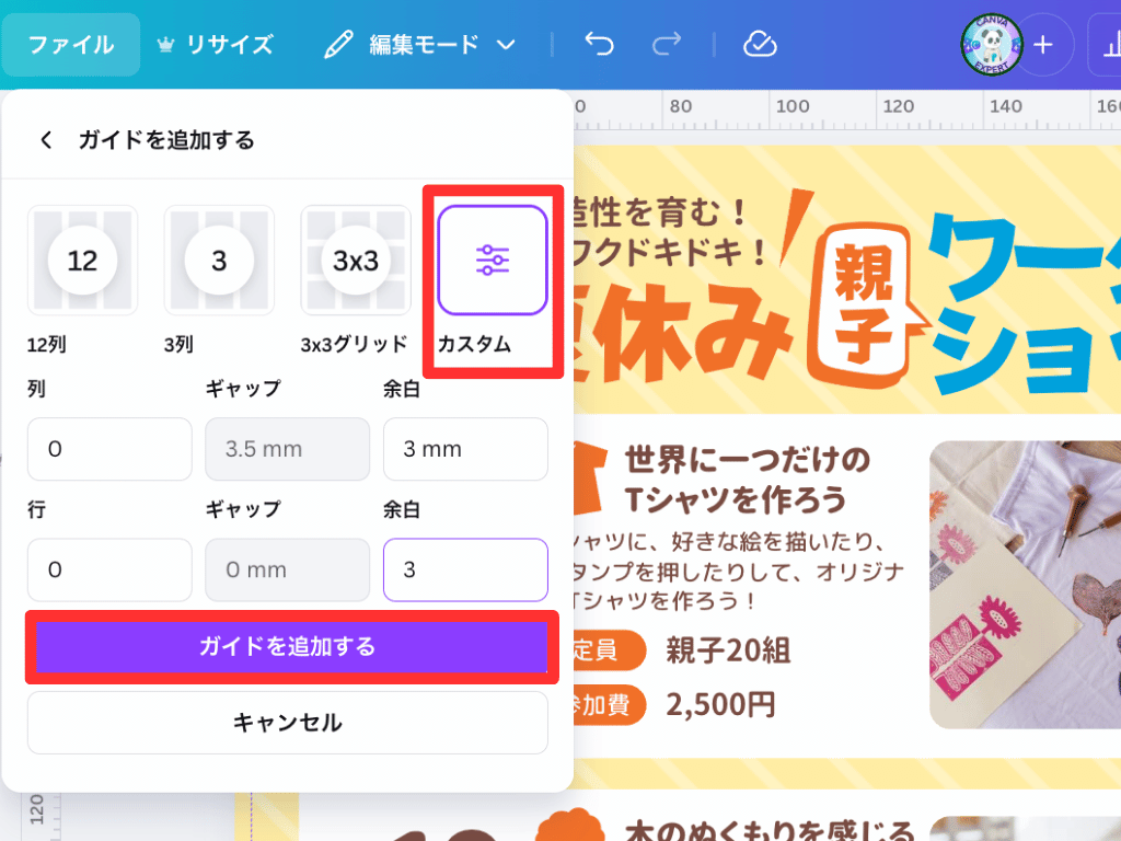 ガイドの追加で印刷エリアを設定したり、危険エリアを把握しておいたりしましょう。